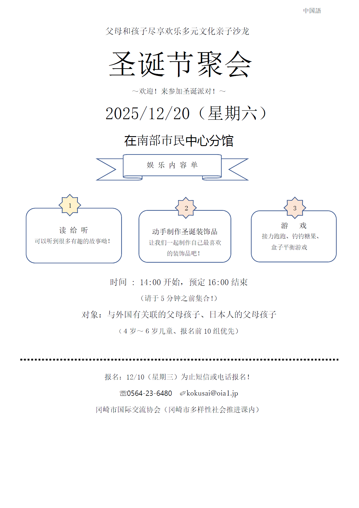 外国につながりを持つこどもとその親が、地域社会に溶け込むきっかけづくりとなるよう、遊びや学習を通じて日本人を含めた親子と交流し、相互理解を深める教室です。絵本の読み聞かせやクリスマスにまつわる遊びや工作を親子で楽しみます★