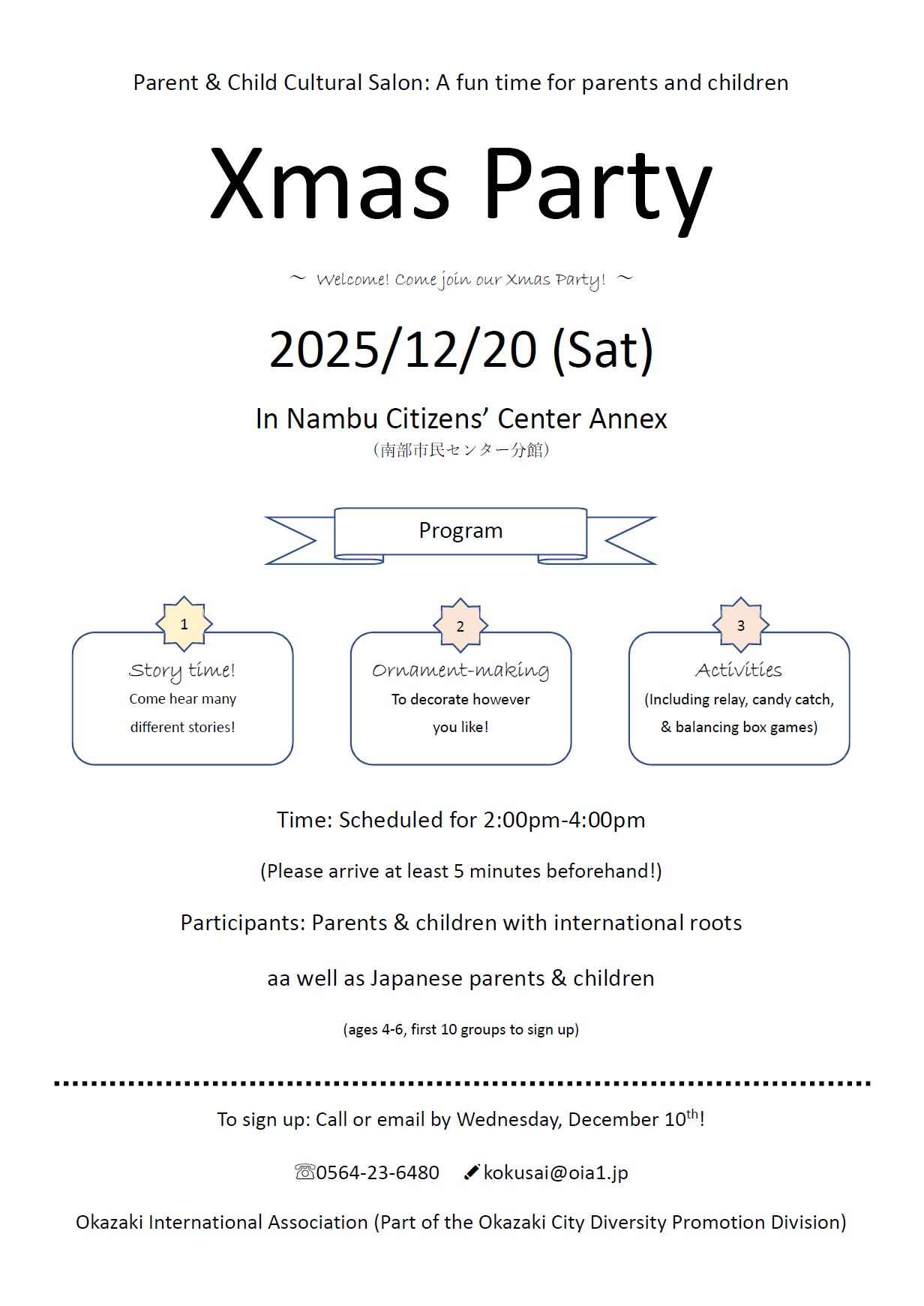 申 込 12/10㈬までに、電話もしくはメール(kokusai@oia1.jp)にてお申し込みください。