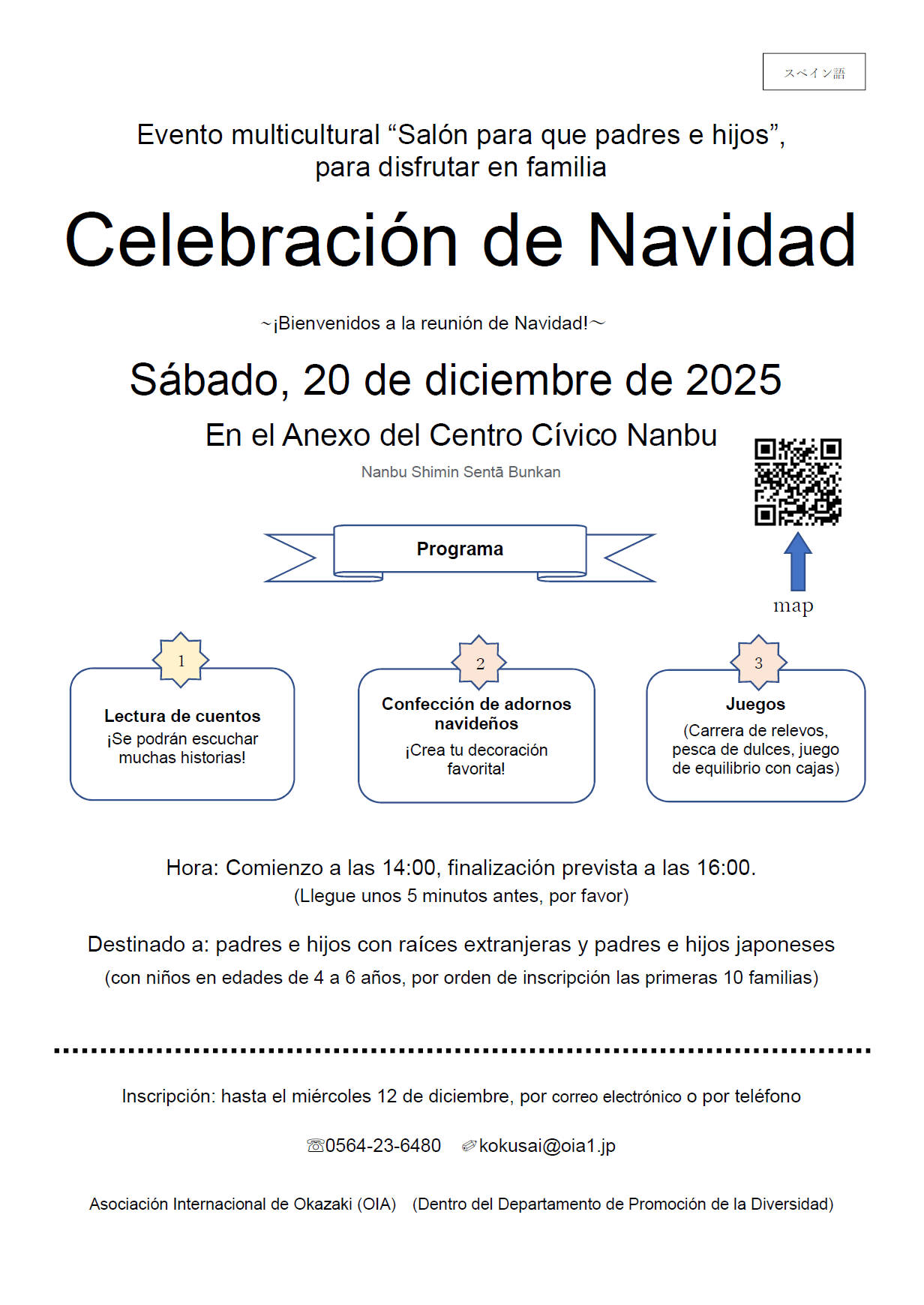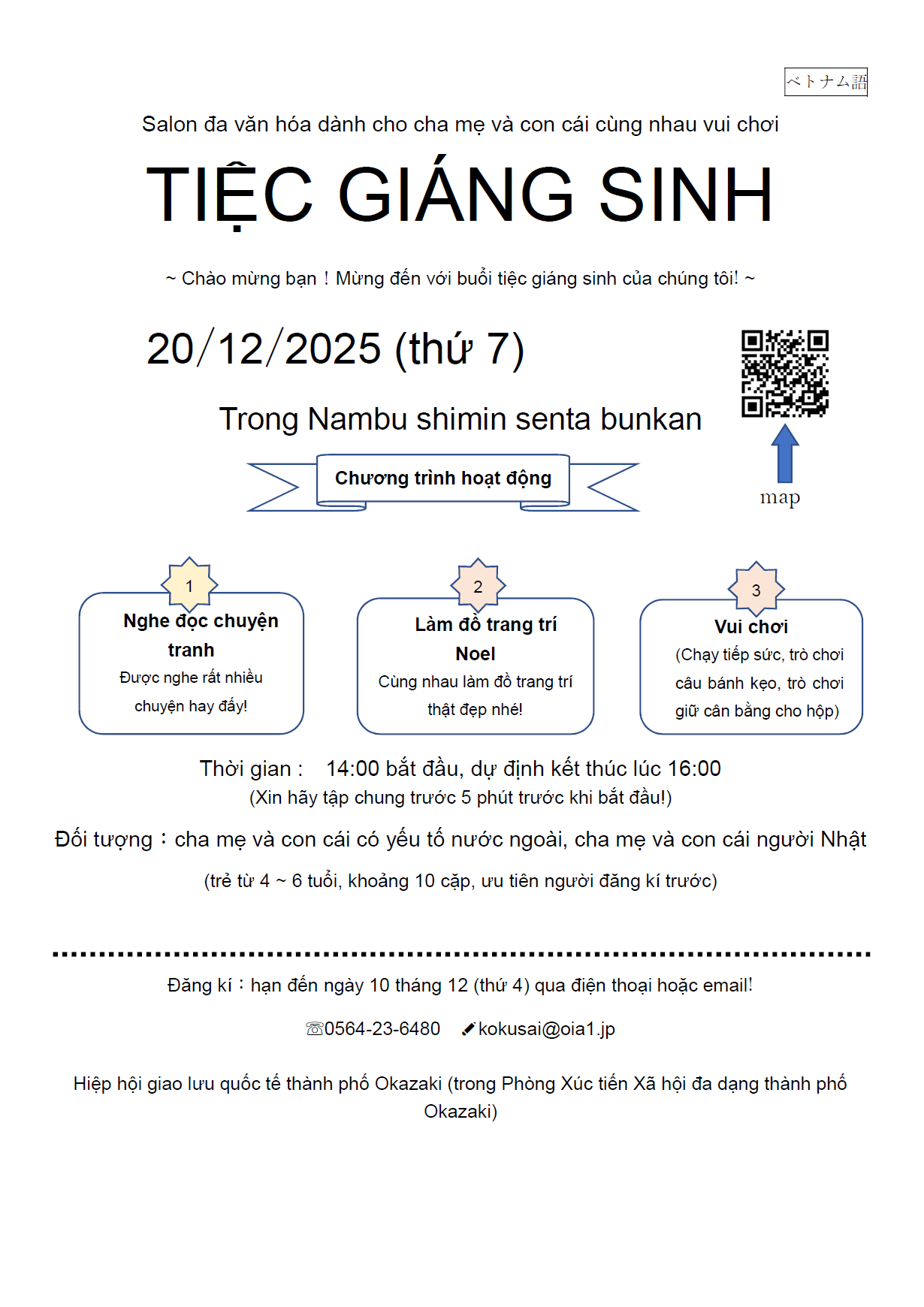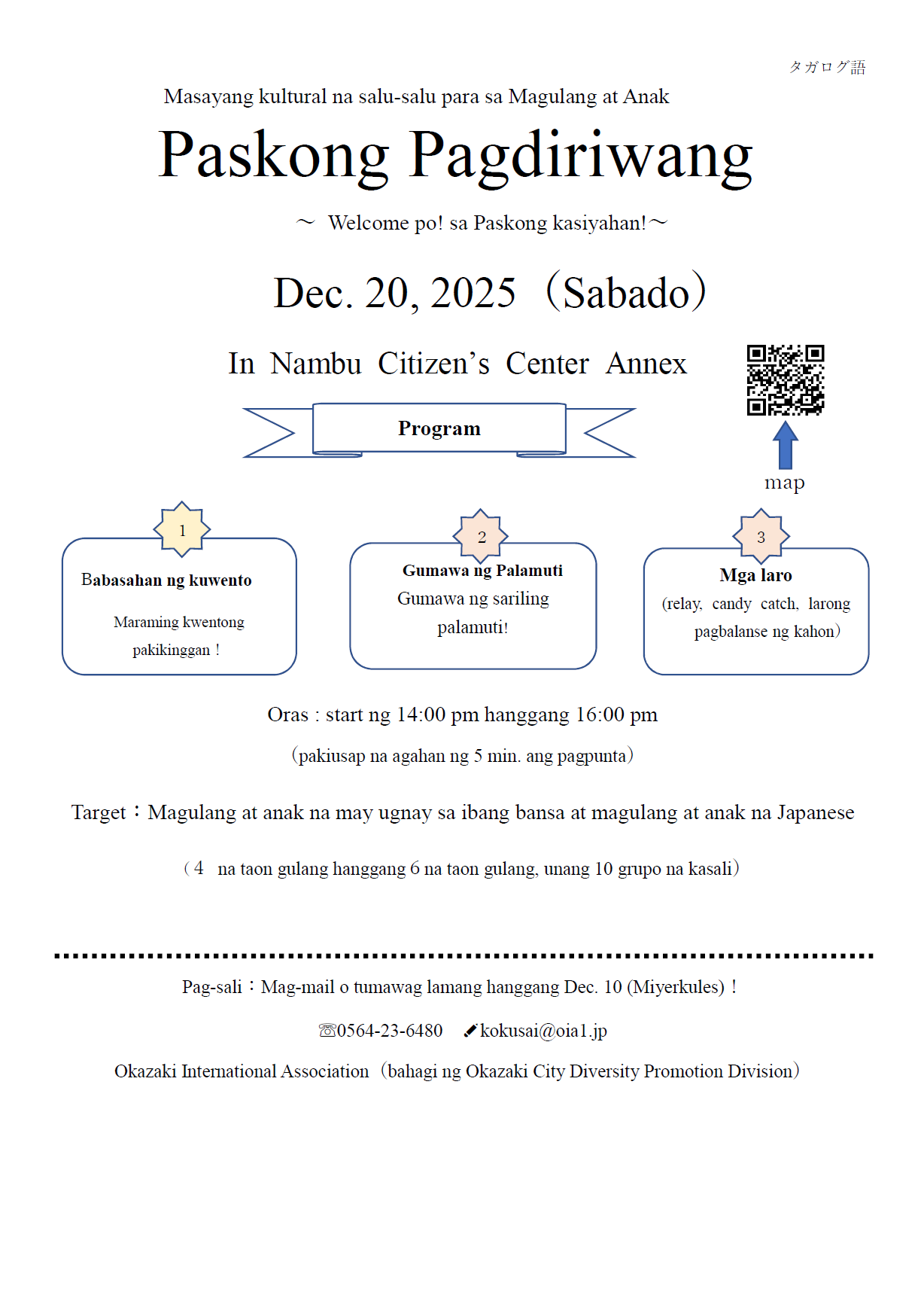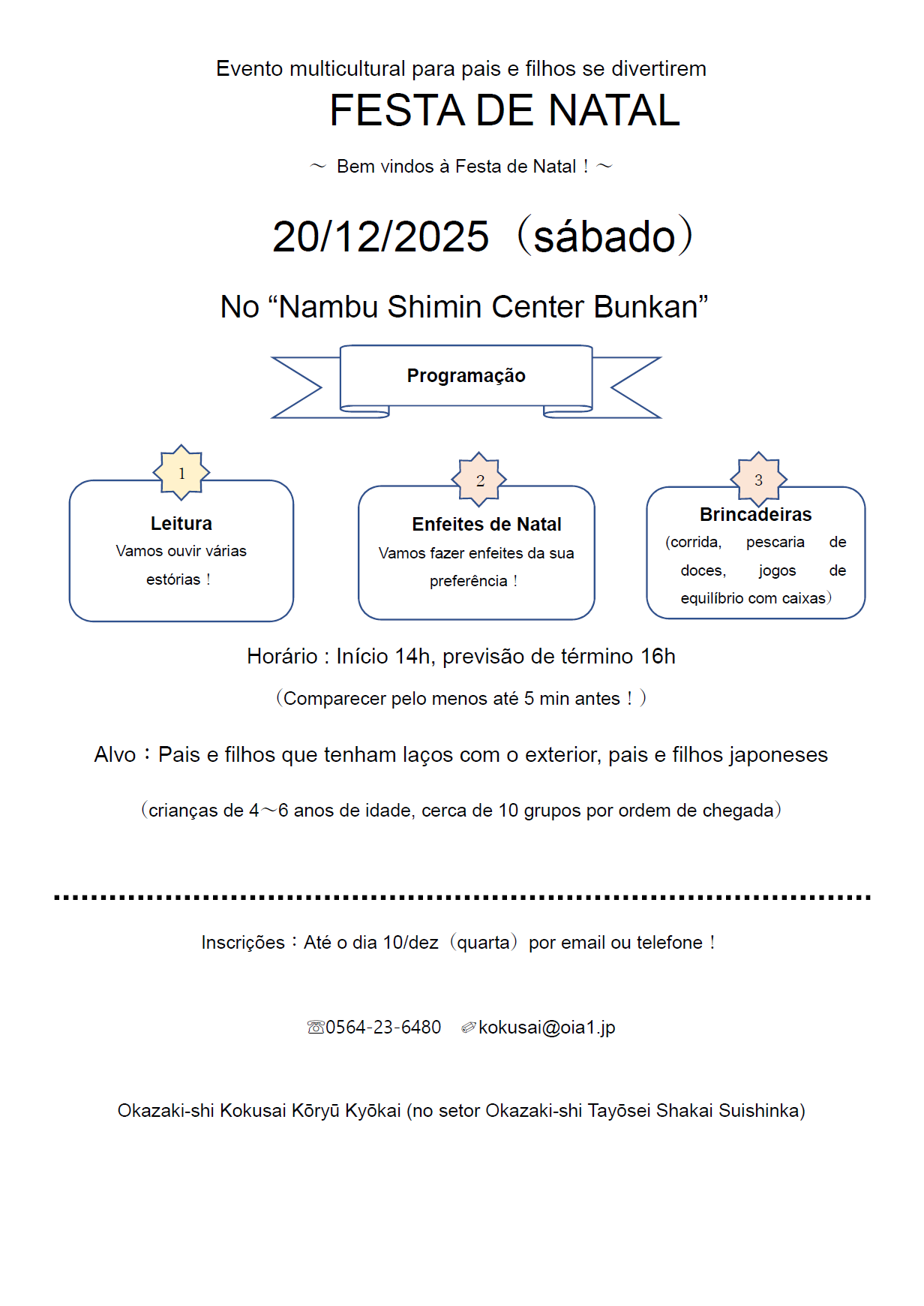 問 合 岡崎市国際交流協会 23-6656(日本語)、23-6480(Português, English, Pilipino, 汉语)