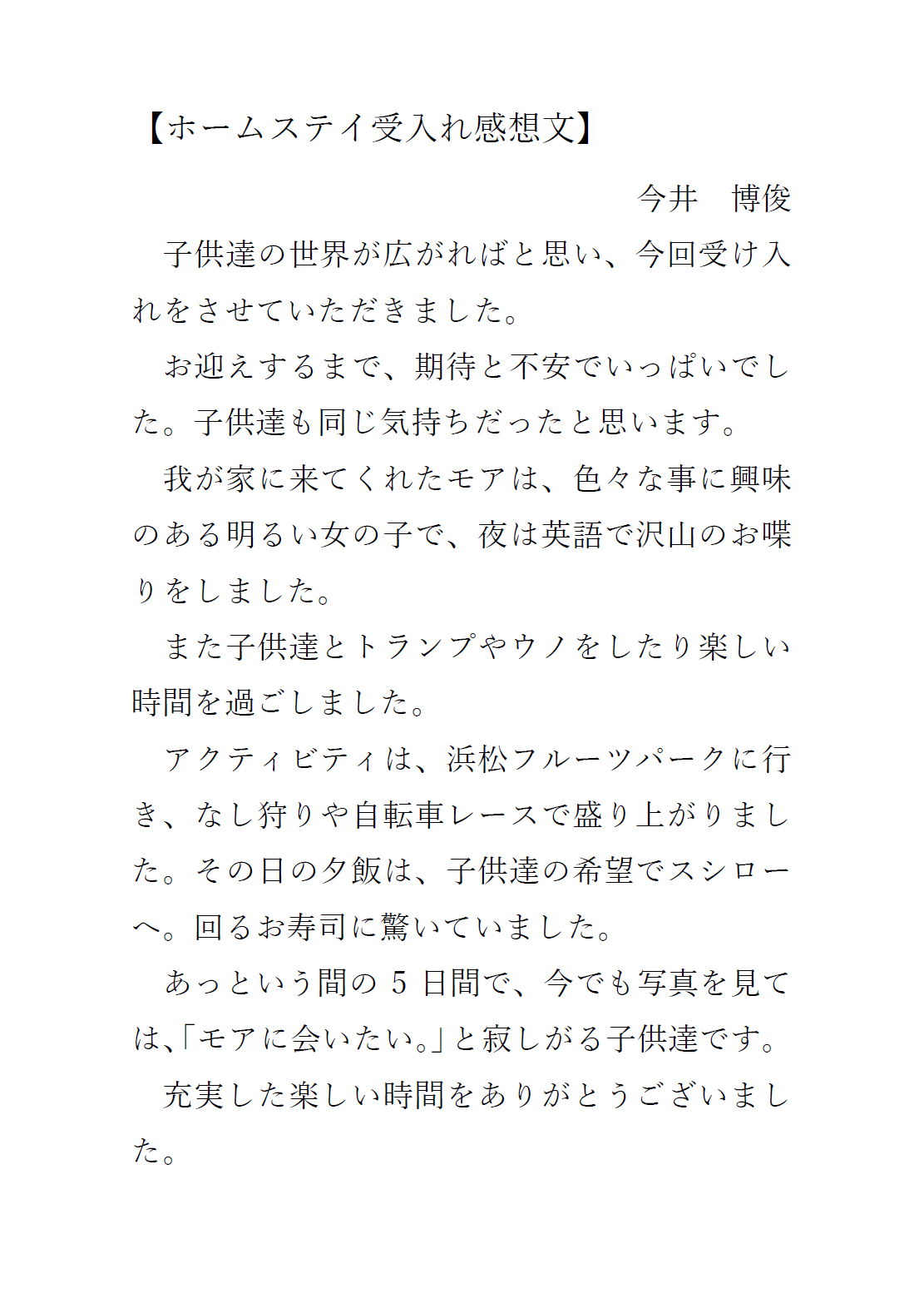 平成29年度呼和浩特市の中学生を受け入れたホームステイ・ホームビジット体験談は